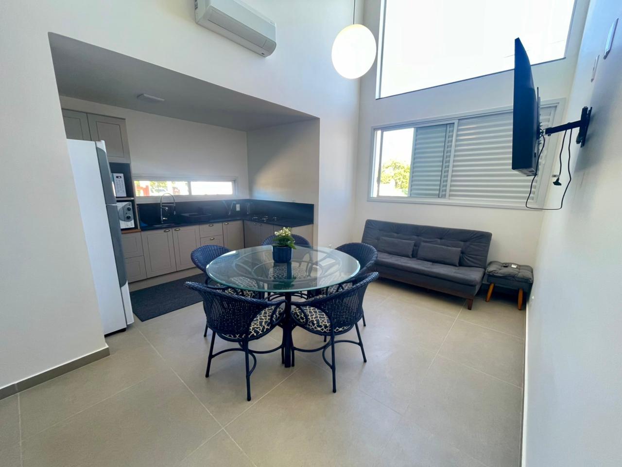 • Cozinha completa com todos os utensílios, louça branca, talheres de inox ( chaleira elétrica, mixer, torradeira, forno elétrico etc..)