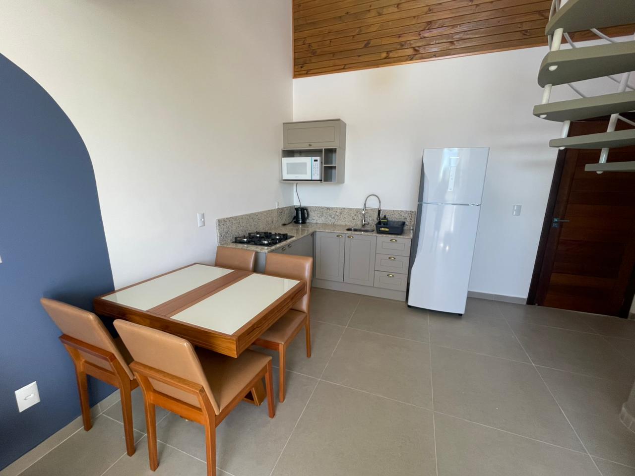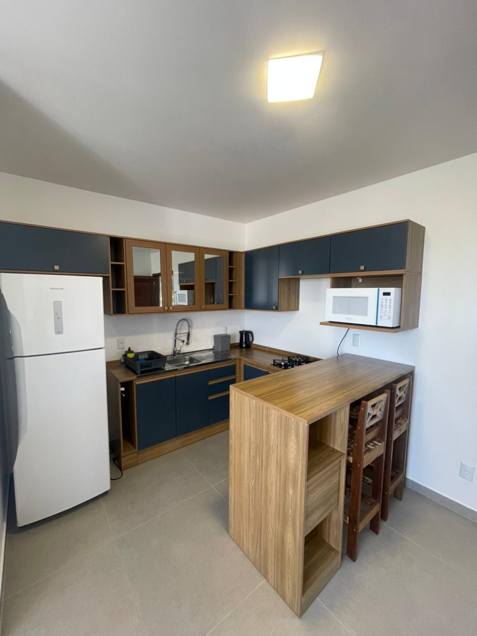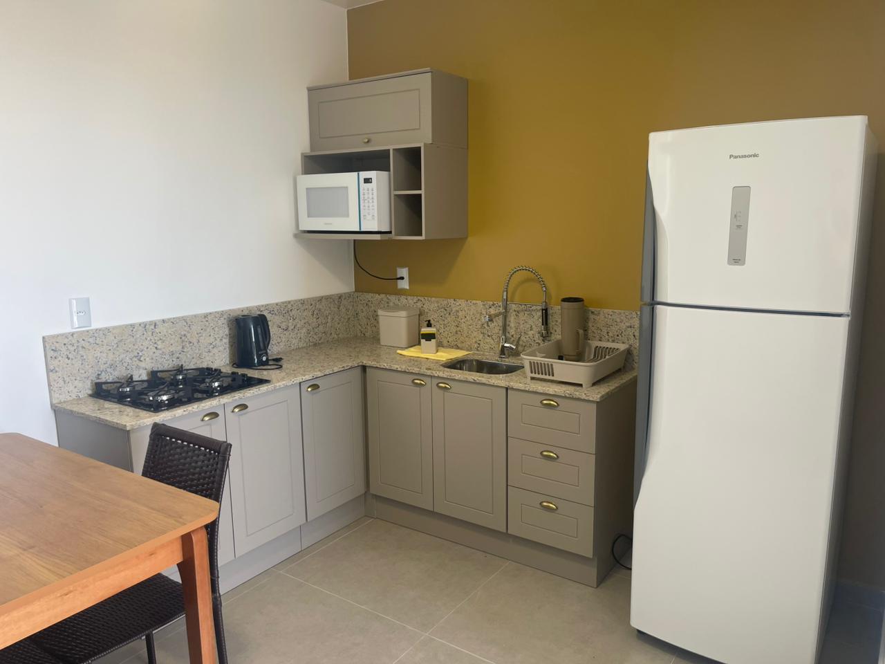 • Cozinha completa com todos os utensílios, louça branca, talheres de inox (microondas, chaleira elétrica, mixer, torradeira, etc..)